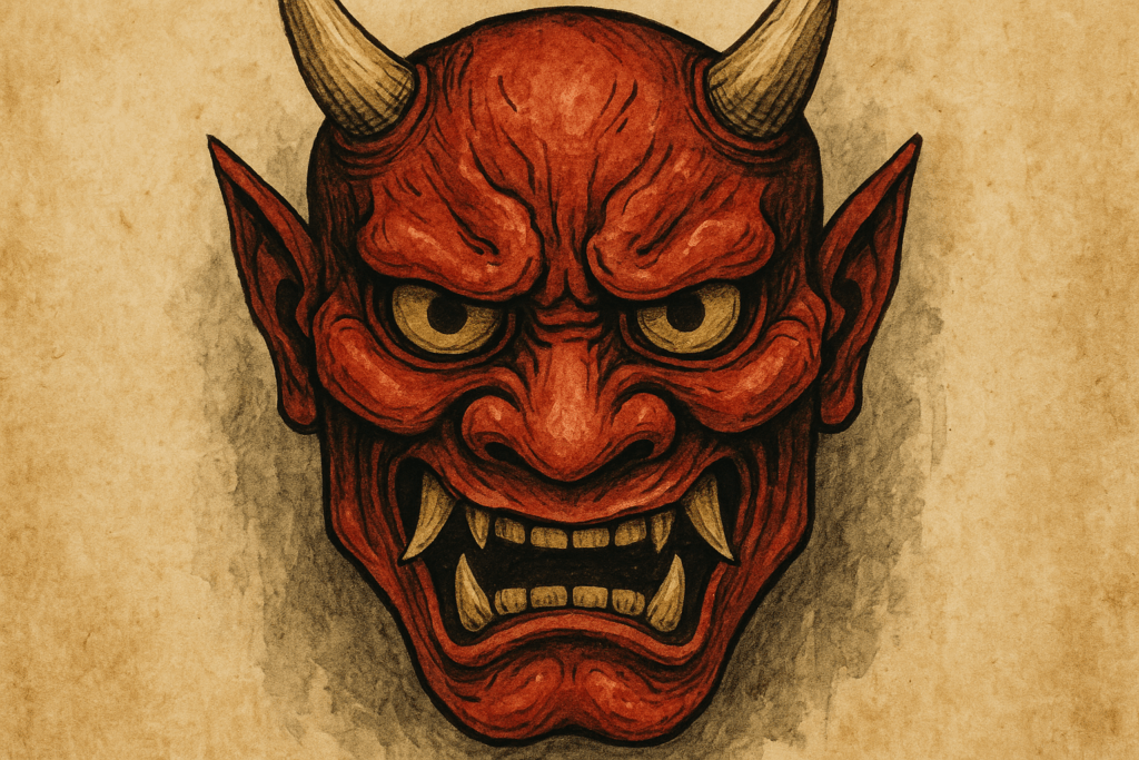 Dans la mythologie japonaise, un Oni (鬼) est un démon yokai ou ogre maléfique, souvent représenté avec une peau rouge ou bleue, des cornes, et une expression grimaçante. Mais contrairement à nos démons occidentaux, les Oni japonais n’ont pas qu’un rôle maléfique.