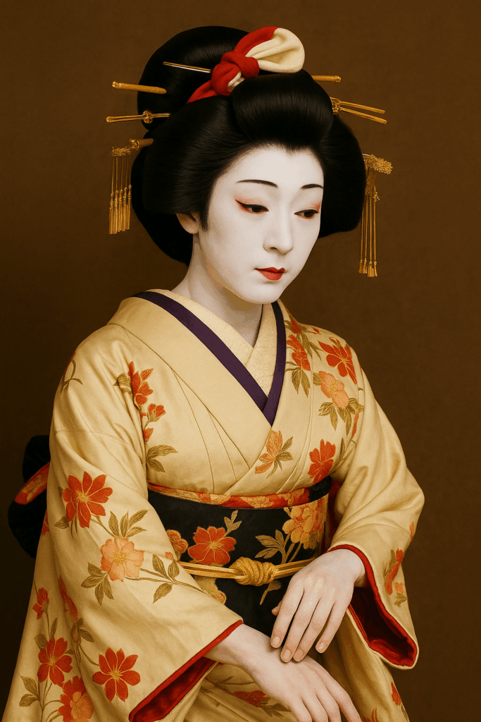 - Kimonos richement décorés : Soies brodées, motifs floraux, couleurs pastel ou vives selon le rôle (jeune fille, femme mûre, courtisane…).